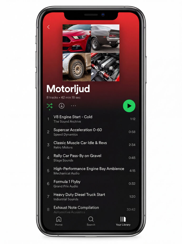 Spellistan innehåller över 50 olika ljud, från Volvo 240:s trygghetssurrande till Porsche 911:s aggressiva sexcylindriga vrål. Varje inspelning är professionellt producerad och optimerad för bilstereosystem.